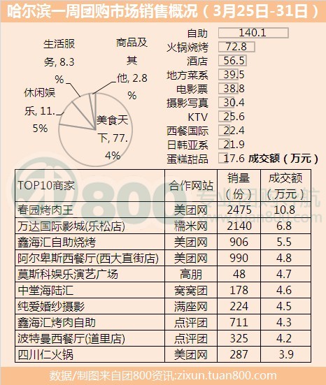 来自团800统计数据显示,截止3月31日,在3月最后一周期间,哈尔滨团购市场共有3203期在售团单,购买人次超过9.2万,人均消费60.7元,平均折扣约为4.8折,成交额近559.8万元。