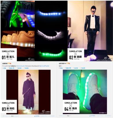 就如这次上新的SIMULATION“发光鞋”,就和众多明星同款。黄晓明、潘玮柏等都曾穿着“发光鞋”出席不同活动。这款纯白复古、极致简约的鞋子,白天能成为万能搭配,晚上则能闪耀炫彩夜光,彰显非凡个性。看黄晓明、杜海涛、潘玮柏、容祖儿等明星也相继在微博亮出穿着SIMULATION“发光鞋”的照片,自认潮人的你,怎能错过这款明星同款潮鞋?