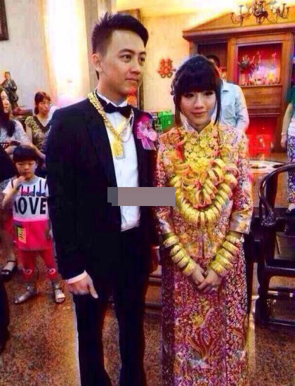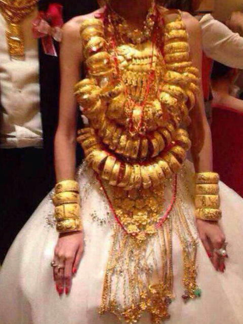 广东一场土豪婚礼引发网友关注,婚礼上,新娘全身穿戴了重达几十斤黄金配饰,包括七十多跟金手镯,手上、脖子上戴满了,而新郎则戴了多条金链子。