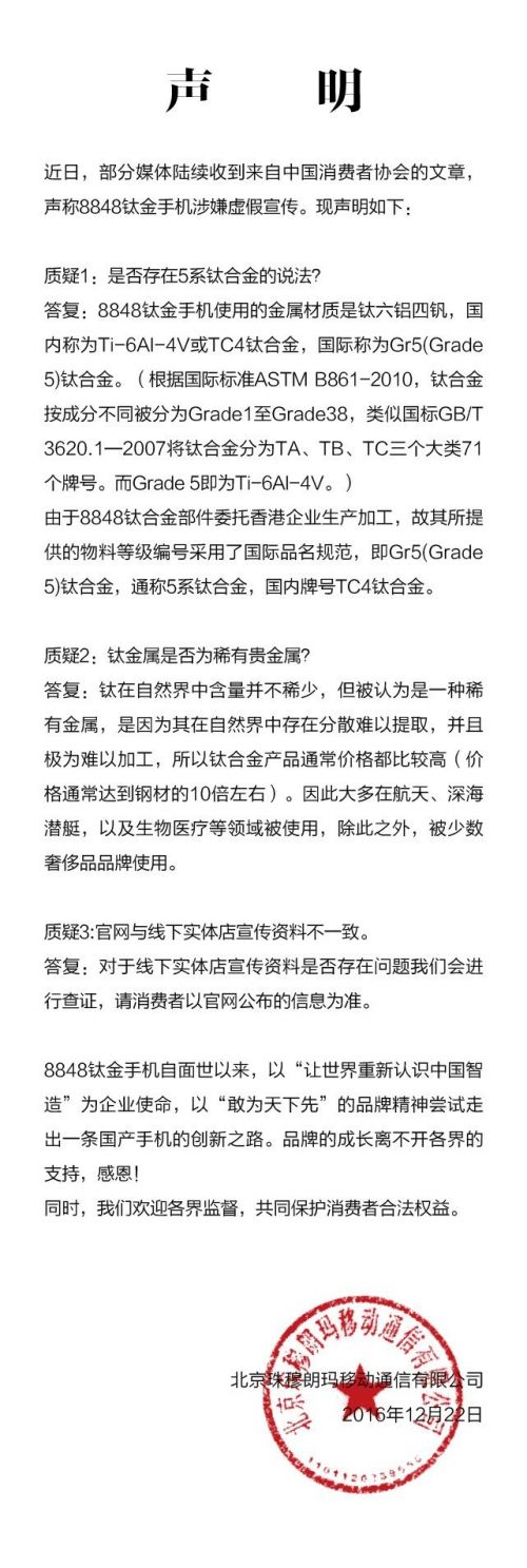近日,部分媒体陆续收到来自中国消费者协会的文章,声称8848钛金手机涉嫌虚假宣传。现声明如下: