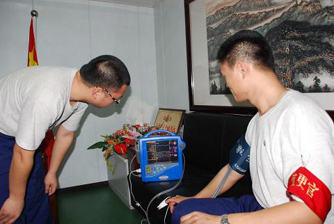 6月5日,“黄山”舰随舰保障医护人员为连续航行两个多月的官兵体检。