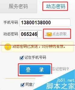 【2】如果您已经忘记了服务密码那么只能通过动态密码来登录了。输入您的“手机号码”点击“获取密码”查看手机接收到的密码后在框框输入后“登录”即可。