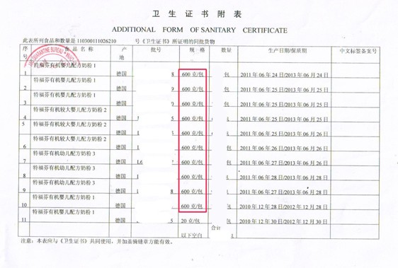 特福芬有机婴幼儿食品是完全原包装进口。下图为进入中国的质检报告。请注意看图中画红框的部分,规格是600克/盒 ,可见进入中国时是盒装的,并不是大包装进到国内再分装的。