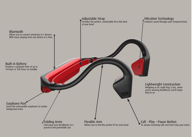 Damson Headbones是一款依靠骨传导技术的设备,即通过震动你的颅骨,将声音传递你的耳朵中。它的优势在于:用户在不需要戴耳机的情况下就可以收听歌曲,从而避免耳机对耳朵的伤害,同时也能让用户时刻了解周围的情况,比如过马路时,你可以一边听歌,一边注意听汽车的喇叭声。