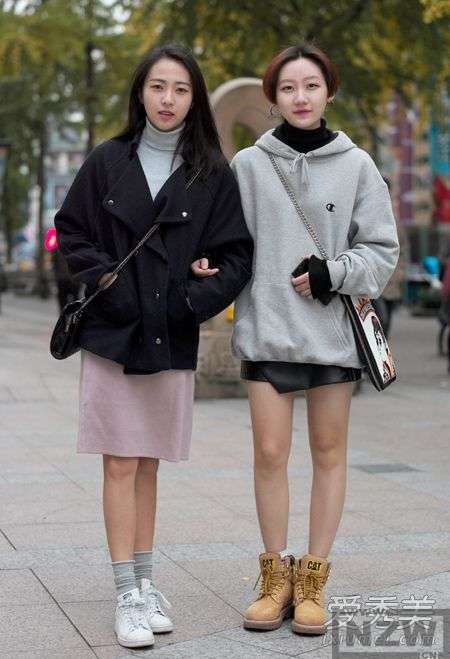 黑色廓形大衣内搭浅灰色高领针织衫,看着貌似有点成熟,用粉色半身裙中和一下就刚好了,棉袜和球鞋的组合极具学生气息,旁边的女孩用浅灰色卫衣+皮裙+大头靴甜美不失帅气,也是值得借鉴的look。