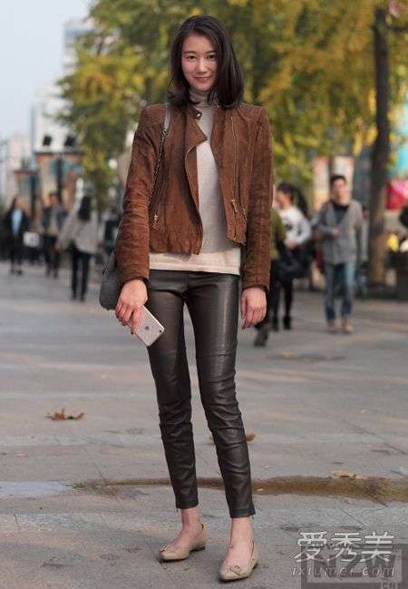 大热的麂皮外套杭州美女们自然不会错过,搭配米色高领衫和紧身皮裤,时髦气场丝毫不输欧美达人。
