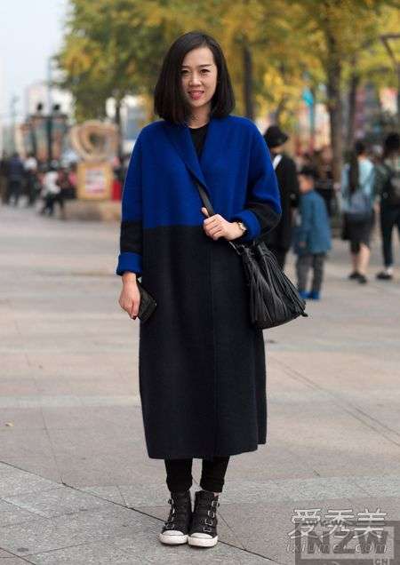 宝蓝色和黑色拼接的大衣也是长款设计,两种颜色搭配很巧妙,宝蓝色不少人都喜欢,不过纯宝蓝色也难免张扬了些,用黑色中和一下是不是好多了。