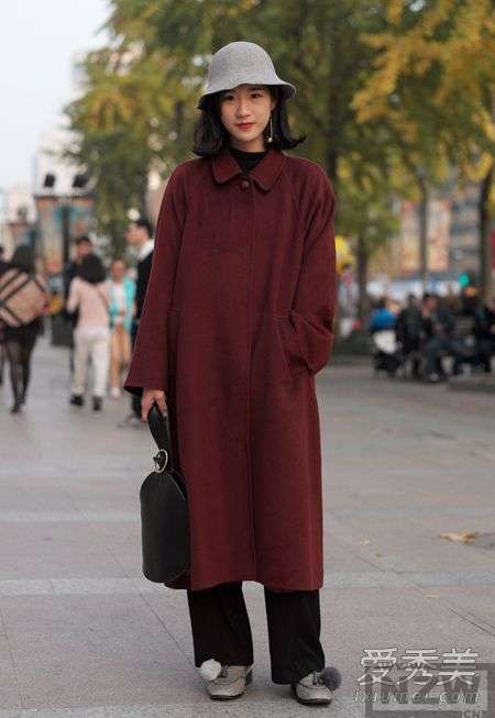 酒红色麂皮外套搭配黑色阔腿裤,加上浅灰色复古呢帽,似乎瞬间回到了30年代的旧上海,有着别样的风情。