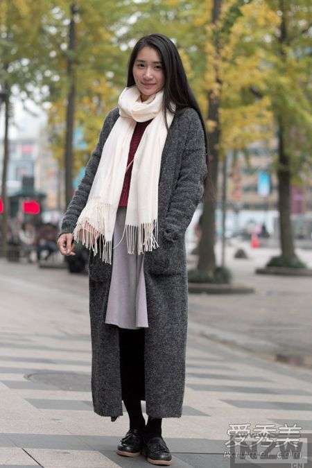今年超级流行长款外套,身材高挑的女孩就可以尽情尝试了,深灰色毛衣外套长及脚踝,内搭文艺范的裙装,浅色围巾搭配的恰到好处,中和了灰色外套的深沉感,还特别温暖呢。