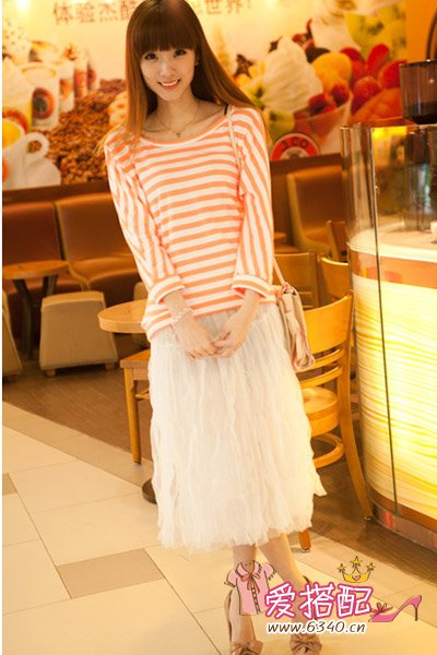海军风格的条纹衫采用了暖色调橘色来提亮整体的肤色,更加的清新小迷人哦!圆领以及9分袖的设计大展甜美之意,搭配蓬蓬长裙,很有邻家姐姐的感觉呢!长发飘飘,森女系的味道浓郁,搭配蝴蝶结高跟鞋,尽显女性的柔情