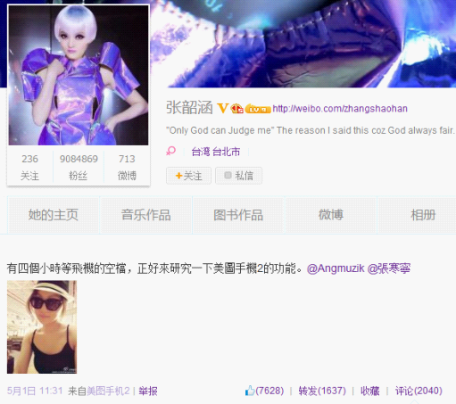 遮阳帽、墨镜、黑色背心,忙着赶往下一个行程安排的张韶涵不忘在机场放上自己的自拍照,跟粉丝亲密互动,没有化妆的她看起来皮肤水嫩到不行,而眼尖的网友也从甜心天后的微博上找到了蛛丝马迹,原来女神的自拍秘籍也是美图手机2,这款美颜手机在娱乐圈中有超高的人气,林志颖、何炅、吴奇隆、谢娜等明星都在用,被称为“女版林志颖”的张韶涵自然不会错过这么热门的3C产品。
