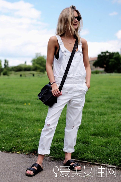 搭配技巧:白色背心+白色背带裤+黑色凉拖+黑色斜挎包