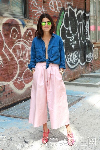 搭配技巧:牛仔衬衫+粉色阔腿裤+粉色绑带鞋