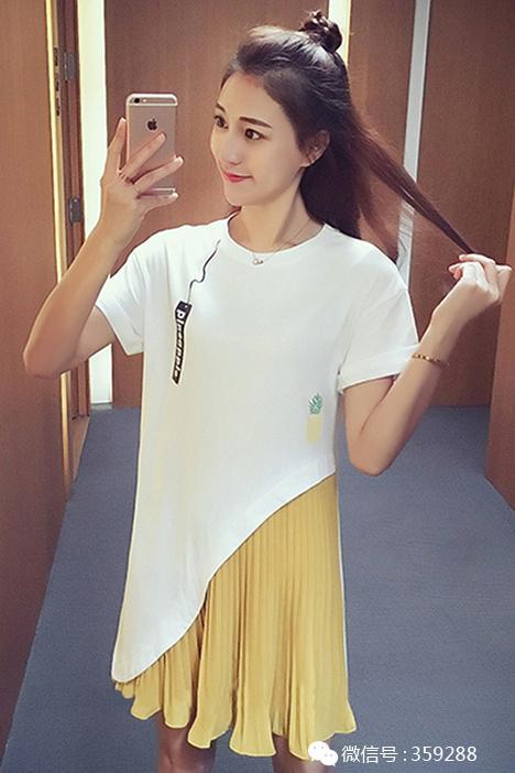 非常甜美清爽的一款连衣裙, 拼接独特设计,短袖长T的款式, 简约时尚度UPUP! 拼色的设计加之百褶效果,非常的有层次感, 也很有垂感! 版型就是很显瘦,偏瘦或者偏胖的MM都可以考虑,喜欢的果断入手哈!
