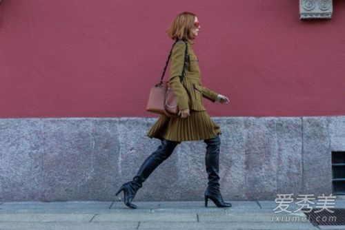 虽然本季百褶裙的长度普遍流行过膝设计,但入冬之后大家不妨穿上及膝长靴,搭配短版百褶裙一展修长美腿!