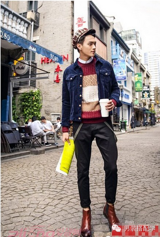 深蓝色灯芯绒外套+条纹撞色毛衣+休闲小脚裤+擦色短靴,这样潮范儿十足的搭配,是你的style吗?