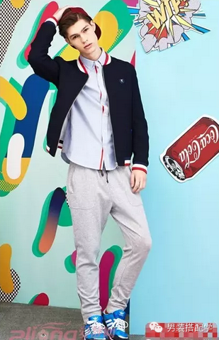 时尚撞色棒球服外套,内搭浅蓝色衬衫,加上灰色运动裤和运动鞋,休闲中又不失时尚气息。