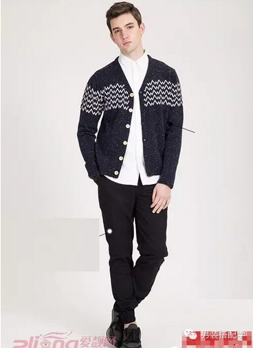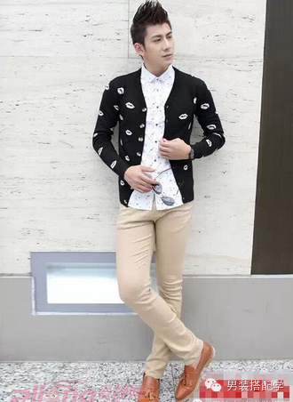 经典黑白色印花针织衫,内搭白色衬衫,下搭休闲裤和英伦风皮鞋,凸显潮流时尚,帅气十足。