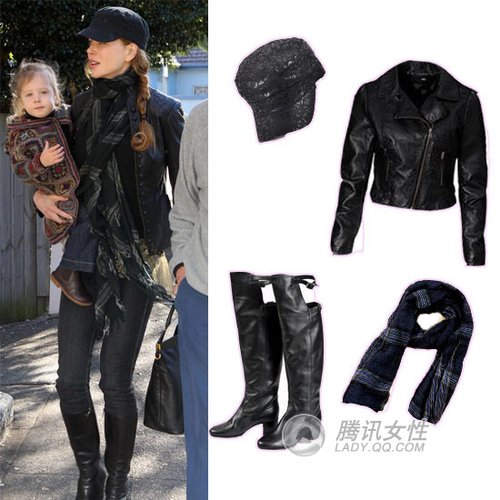黑色格子围巾 + 黑色皮衣 + 黑灰色牛仔裤 + 黑色高筒靴