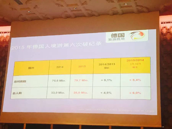 发布会上,李朝晖女士公布了2015年中国游客赴德国旅游人数突破139万,同比增长34.8%,中国游客在德间夜数(即宾馆每间客房的入住天数)再创新高,达到254万间夜大关。作为远程客源国市场,中国在德国国外游客客源地中名居于前列。据最 新数据显示,德国十座大城市组成的魅力名称联盟统计数据显示, 中国游客在魅力名城联盟城市中创造的间夜数占中国游客2015年在德国创造的总间夜数的39%,共计99万间夜。其中,中国游客到访最多的城市为慕尼黑(间夜数达28.8万),紧随其后的为法兰克福(27.9万),科隆和杜塞尔多夫分别以 8.08万和7.95万位列第三位和第四位。其他六大城市排名为:斯图加特(7.2万)、汉堡(7.1万)、纽伦堡(4.25万)、汉诺威(2.05 万) 以及莱比锡(1.15万)。