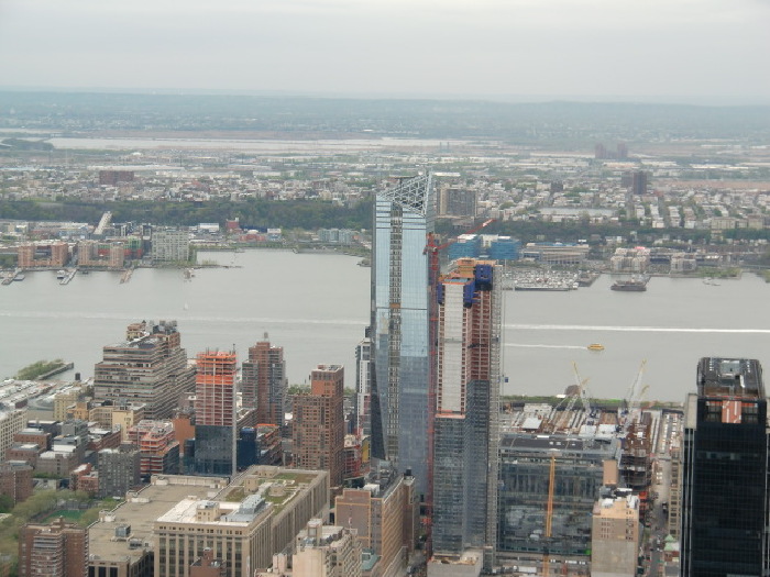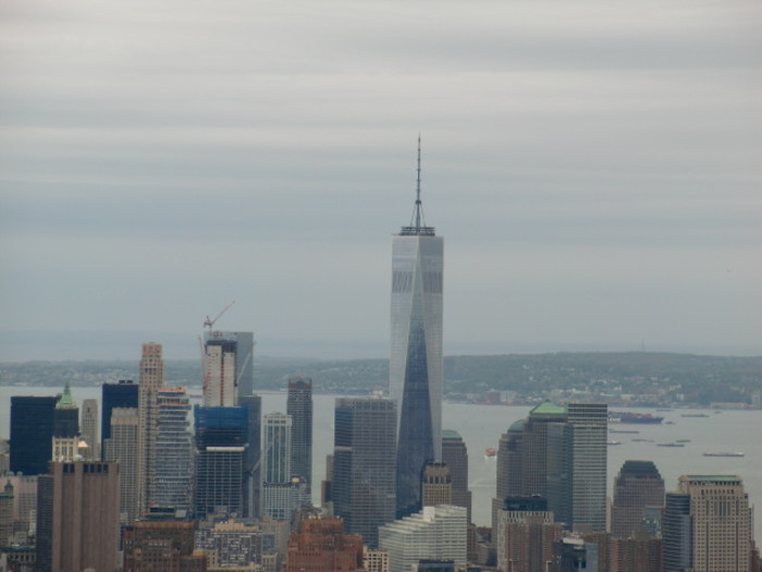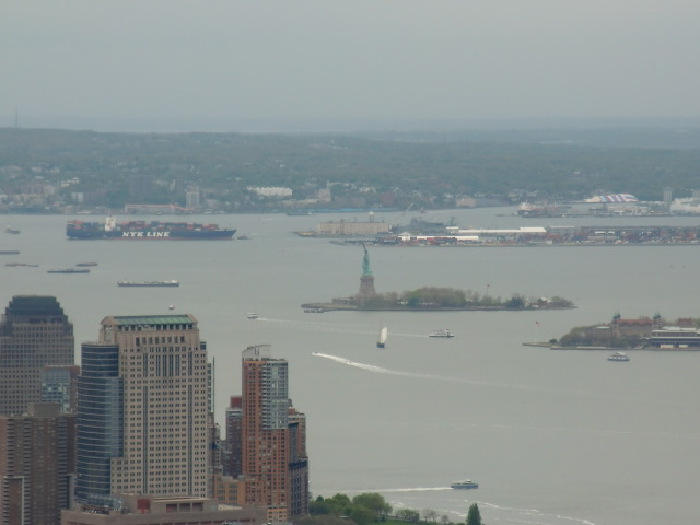 帝国大厦检查跟机场过关卡一样严格,我包包里有杯菊花泡枸杞茶,用玻璃杯泡的,被搜出来了,说不能带上去,叫我参观好下来拿。 帝国大厦电梯直达80层,这里有个商店购纪念品的,绕过商店,再次坐电梯达86楼,我登高望远纽约的全景摄入眼帘,高层建筑林立而起,参差不齐,自由女神像看上去很小,哈迪逊河对面就是加拿大。下楼后商店是必经之路,大家都没买东西,到达二楼我赶紧去把杯子拿回来,这很重要。