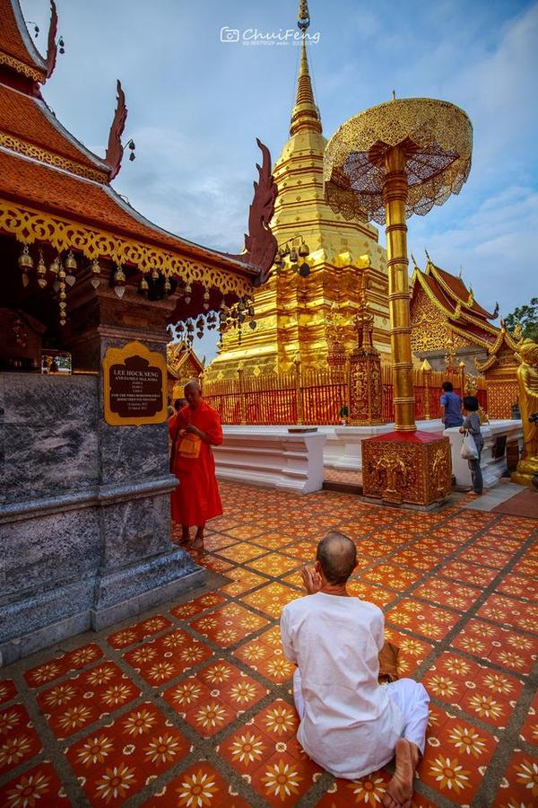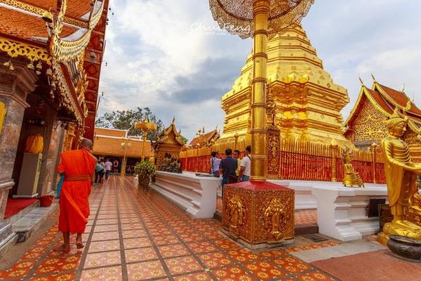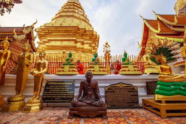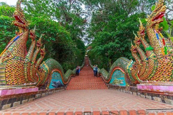 清迈的双龙寺,因金光闪耀,显得相当突出,它位于海拔三千多英尺上的素帖山上,由山上往下看正可俯视清迈,是著名的佛教避暑胜地,该寺是一座纯正的泰式寺庙。