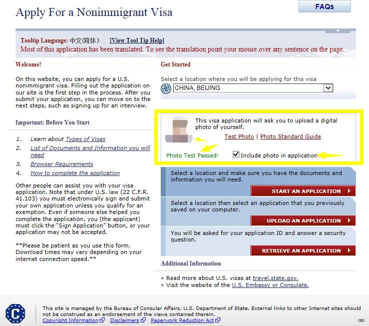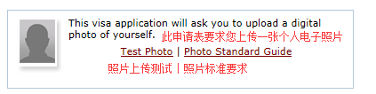 3.点击下拉选框中的”CHINA,BEIJING"后页面自动跳转,页面右侧出现要求上传照片的文字”this visa application will ask you to upload a digital photo of yourself",点击"test photo"