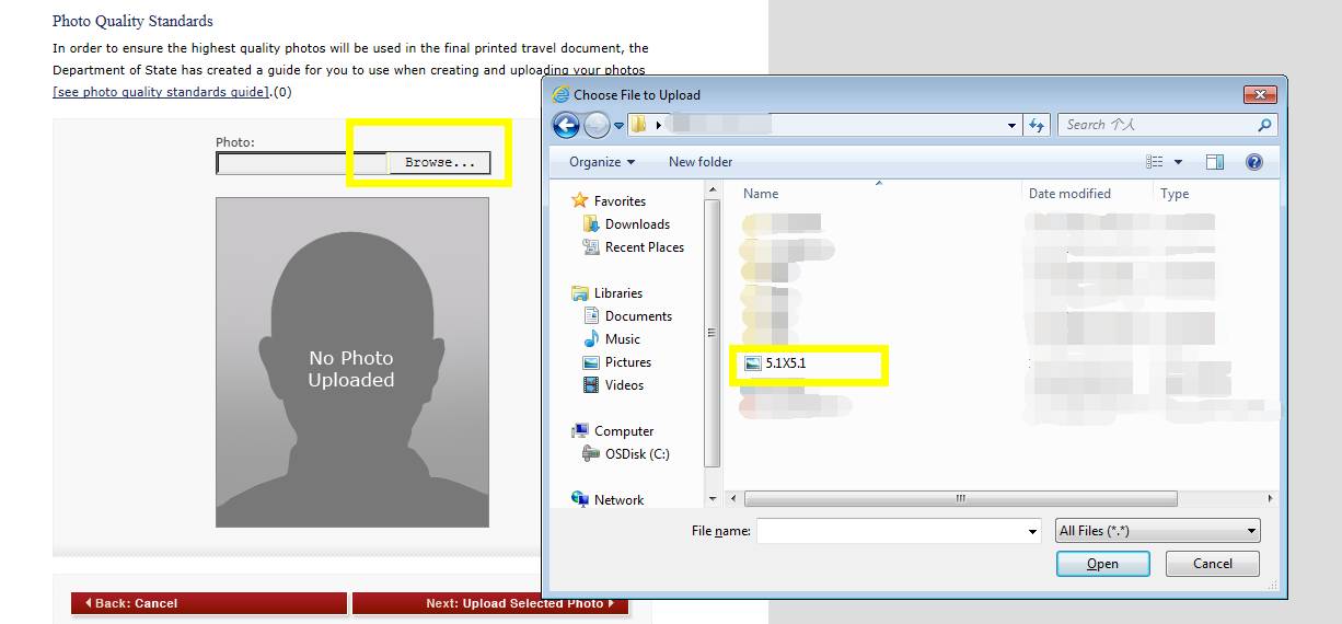 4. 点击"browse"在电脑本地找到保存照片的文件夹并选择相应照片,然后红色字框“next:upload selected photo”,页面会自动跳转到下一项。