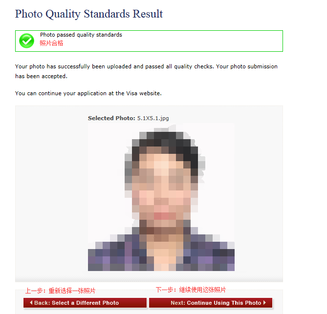 5.如果跳转页面有绿色标识,英文“photo passed quality standards"表示照片审核合格,可以点击红色字框"next: continue using this photo"后开始填写表格,如果出现不合格提示,则需要点击红色字框“back:select a different photo"重复第4步上传新的照片进行审核。