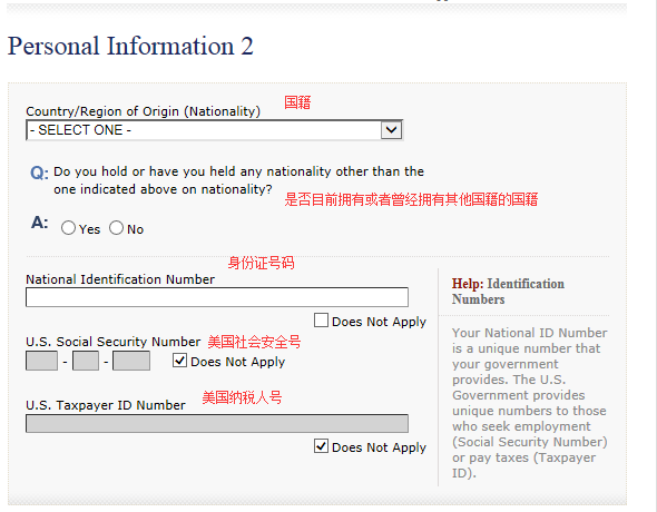 13.进入下一页“personal information 2",按照护照和身份证内容填写。其中的"U.S. Social Seciruty number”和"U.S. Taxpayer ID Number“两项对于我们大多数人来说都是不适用的,可以直接勾选"does not apply"。填写完毕后,点击Save,重复第11和12步进入下一页面。