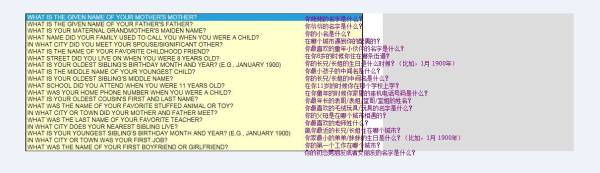 第二部分:右上角有一个Your Application ID: AAxxxxxx,这就是你申请表的唯一识别码,请务必记住!!!第三部分:下方有一个”Security Question”安全问题的下拉选框,选择一个问题(问题翻译在图片中,可放大查看),在answer部分用拼音或者英文写上自己的答案,并记住这个问题及答案(系统默认大写字母)。