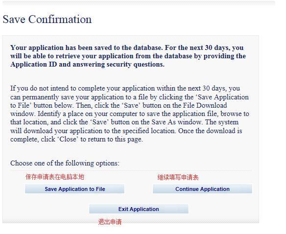 11.点击save后页面会出现如下图片,有三个选项1)如果是想以后再继续填写,就点击”save application to file",这个是将之前填写的内容下载到电脑本地文档中,以后申请时可以上传继续使用 2)如果是继续填写表格,就点击"continue application"进入下一页面 3)如果是放弃填写,就点击“Exit Application”,如果选择exit application但没有记住之前的AAA申请表ID号,之后就无法找回本次填写的内容了。12