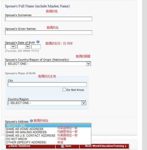 21. 进入下一页面“Family Information: Spouse",填写配偶信息。填写完毕后,点击Save,重复第11和12步进入下一页面。