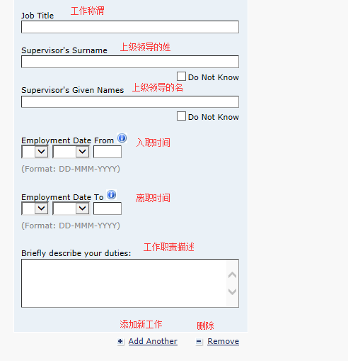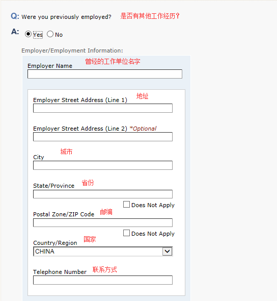 23.进入下一页"Previous Work/Education/Training Information",这一页是填写之前的工作信息和求学信息。如果你之前在其他公司工作过,就按照时间的倒叙方式逐项添加工作内容,最多添加3家公司信息。