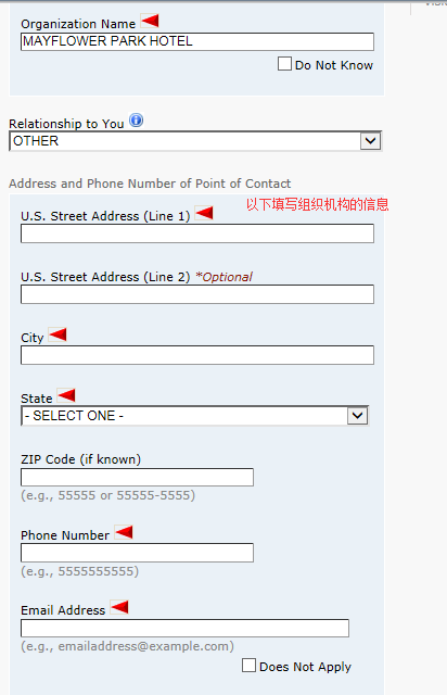 19.进入下一页面"U.S. Point of Contact Information",这一页面是填写在美国的联系方式,如果美国没有亲戚朋友只是单纯去玩,就把联系人勾选"do not know"(个人建议勾选此项,避免产生有移民倾向或者长期滞留的印象);在组织机构位置可以填写上一页输入的酒店或者商业中心的名字。填写完毕后,点击Save,重复第11和12步进入下一页面。