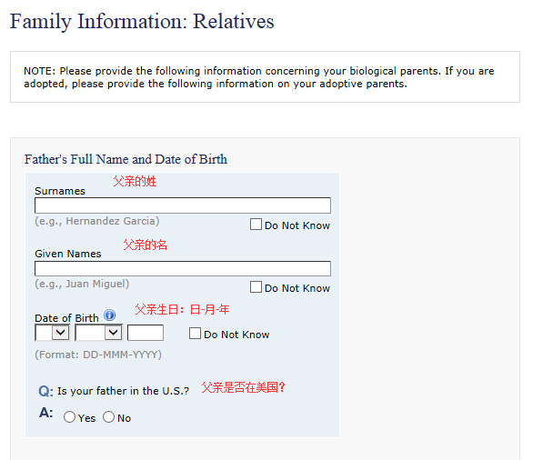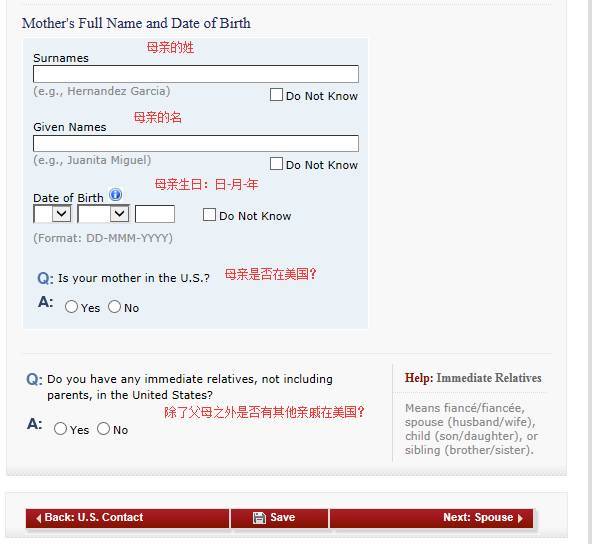 20. 进入下一页面“Family Information: Relatives",填写父母信息。填写完毕后,点击Save,重复第11和12步进入下一页面。