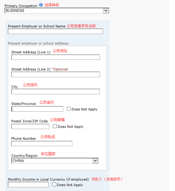 22.进入下一页面"Present Work/Education/Training Information",这一页是选择目前的工作/教育/培训信息。如果是工作,可以选择"business”。填写完毕后,点击Save,重复第11和12步进入下一页面。