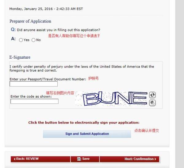 在你点击“sign and submit application"之前一定要确认两点:1)所有填写的内容准确无误 2)电脑已经连接了一台打印机,因为DS160表格在提交之后只有一次打印的机会,如果你当时没有保存,后期是无法再打印表格内容的。