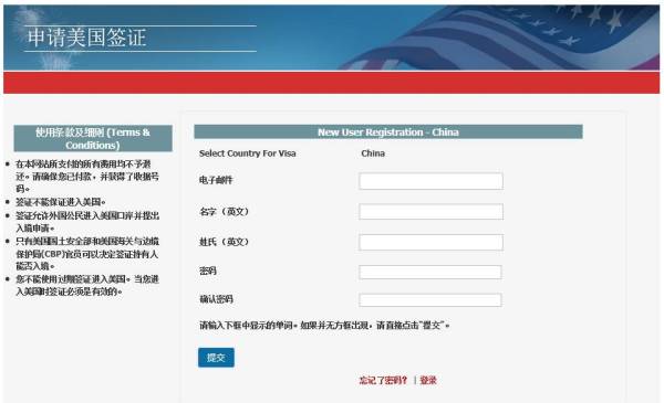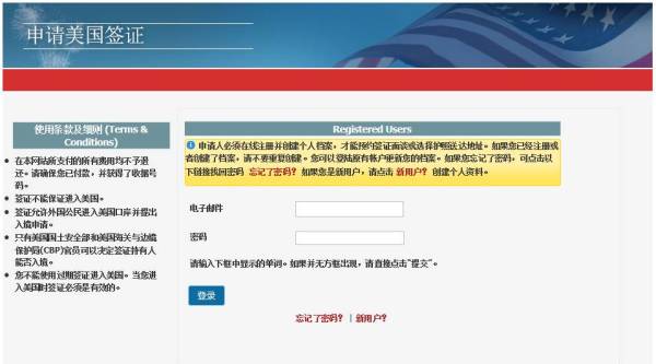 1.登录上面的网址后如下页面,点击最下方的"新用户”进行注册。注意新用户注册的邮箱需要与填写DS160表格时候输入的个人邮箱一致,否则在进入页面操作时系统会提示无法通过。