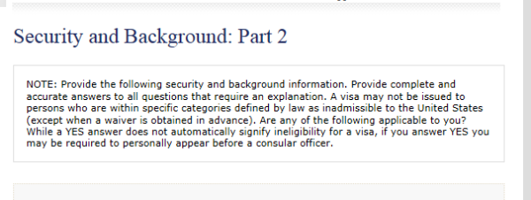 25.进入下一页"Security and Background: Part 1-Part 5" ,这5个部分主要是调查是否有一些反政府,恐怖主义,重大传染疾病的背景,所以只要所有的选项都选择No即可,在这里就不逐条翻译了,具体可以把鼠标放在问题上看在线自动翻译的中文解释。
