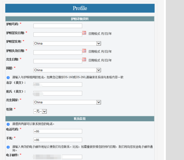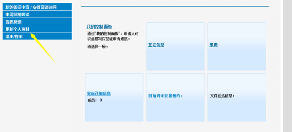 2.注册完毕后登录进入相关页面,点击左侧”更新个人资料“。如果是有家人一起申请签证,可以将家人的信息添加在这个账号中,一起申请面签时间。