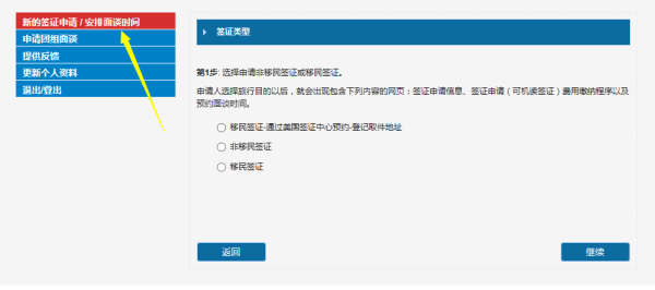 3.个人及家人信息填写完毕后就可以点击右上角的”安排面谈时间”,这里面全部都是选择,每一页现在完毕后点击“继续”即可。依次选择签证类型、输入个人信息、添加亲属、选择文件送达地址、确认签证费用的缴纳状态。