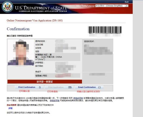 2)DS160确认信打印件(不是DS160表格内容,是步骤2里面第28步的那个带照片的确认信,如下图)