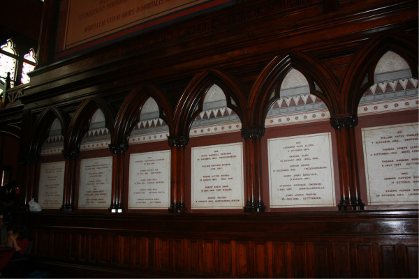 (11) Memorial Hall – 纪念堂。纪念堂于1878年建成,分为四个部分,十字涌道纪念在内战中为联军作战阵亡的136名哈佛毕业生;桑德斯音乐厅;学生会;安能堡厅(Annenberg Hall)。其中十字涌道纪念堂是唯一向公众开发的地方。纪念堂的墙壁上挂着阵亡之士的名牌,上方的彩色玻璃许多都是哈佛各界毕业生捐赠的,用的是第凡尼和拉法格公司的制品。安能堡厅现在是大一新生食堂,只为大一学生提供餐饮,据描述与哈里波特中的霍格沃茨魔法学校的食堂很相似。霍格沃茨魔法学校的食堂原型是牛津大学基督教会食堂,而哈佛受英格兰的影响非常深刻,建筑的风格相似也在情理之中。据说在1900年的时候,这间食堂每天的菜单包括14道汤、6份鱼、12道烤肉、6道野味、2个冷盘、6个蔬菜、10道甜点,非常丰富,在哈佛的每个住宿学院相继开放自己的食堂后,安能堡厅一度被弃用,直到1994年,安能堡公司的创始人为了纪念他毕业于哈佛的儿子,捐款重新修建了食堂,现为大一新生使用。