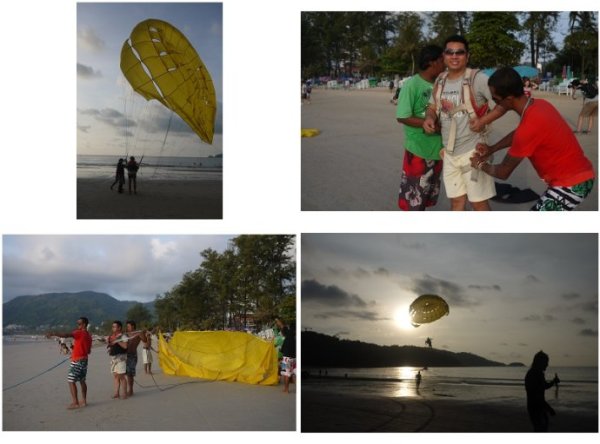 到了之后,果然,沙滩是黑色的,泥一样,水也不蓝,不知道早上是不是也这样。人倒是很多。我们站了一会,拍了两张照片,正好赶上一个外国人在玩滑翔伞,我就怂恿张老板也玩一次,要价1200B,砍了一下杀到1000B,收钱的一个像黑社会的哥们过来跟我说,如果别人问,我得说是1500B成交的,那人脸上有一道新缝合的大刀疤,还挺恐怖的,我赶紧点头说OKOK。