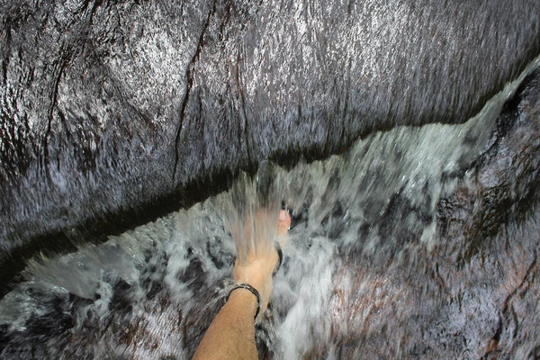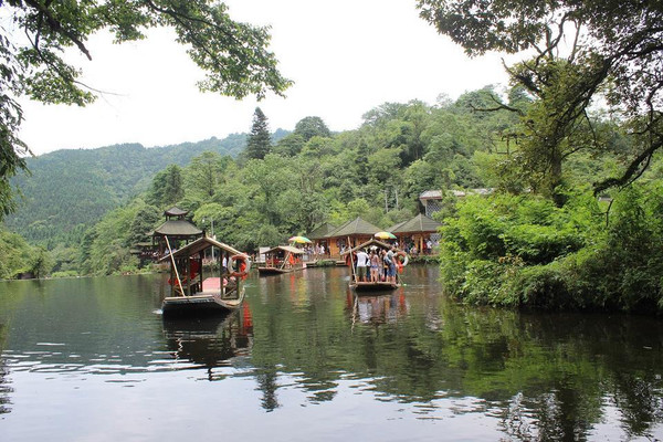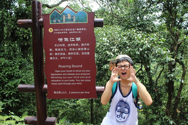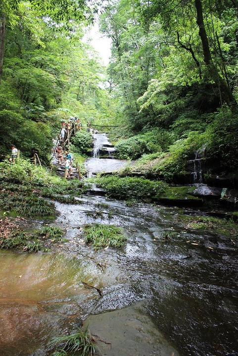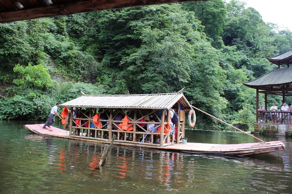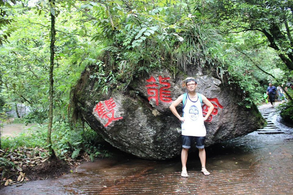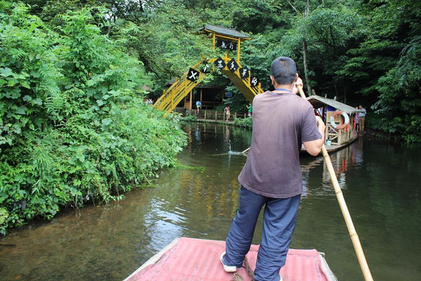 总归不甘心,于是退房后又一起往山顶走,果真白天还是游人如织,买了香草沟的票,坐着竹船过了十多米宽的河,然后在水世界里摸索了一两个小时。景致清幽,高山流涧,不过若是一家三口换了泳衣在这天然水世界里游玩,似乎更合适。