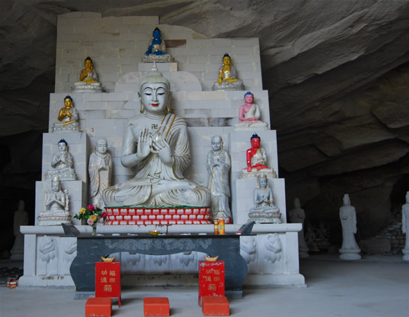 到该寺入口,尚感知不到文化建设的氛围,外围的保护与配合也未能跟上,入寺大道未修、临时通道比较颠簸。进入洞中,却已有多个洞区的殿堂初步可见,包括:3号洞区的法坛、般若堂和救胎地藏殿,4号洞区的大雄宝殿和卧佛殿,2号洞区的圣财宝殿和1号洞区的圆通宝殿。根据“人无我有、人有我优”的开发原则,慈恩寺常住僧人在艺术家们的配合下,在佛教造像上正在作种种造型开发的尝试。