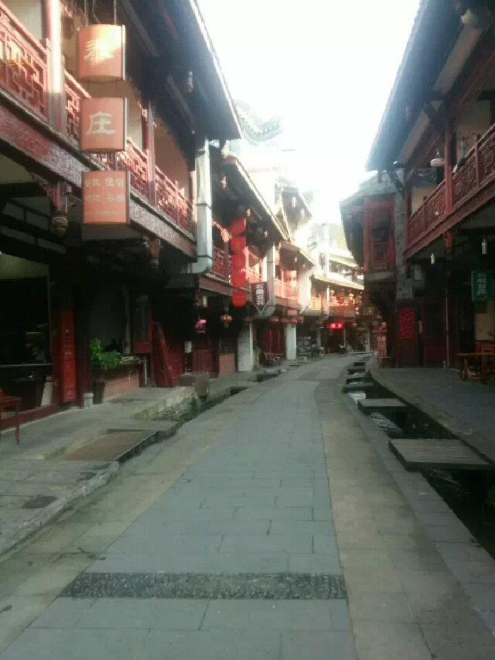 从游客中心出发,一路向上而行,第一站便是泰安古寺。古镇依山而建,中心地带不过三条小街,正街石砖铺就,两旁俱是两层仿古建筑,一店一幢,大小虽有不同,但都修建装饰得十分精致,石刻木雕飞梁画栋毫不马虎,街道和两侧房子间各隔着一条青石小水渠,水流清澈,青石光滑可鉴,石缝中长着兰草菖芙,葳莛碧绿,木楼檐廊上又有青苔石厩里漂些铜钱草或睡莲,这一细细打量,在人车鼎沸声中竟生出宁静来。于这小镇喝一杯茶,吃一点当地的小吃,积蓄着向上的能量。