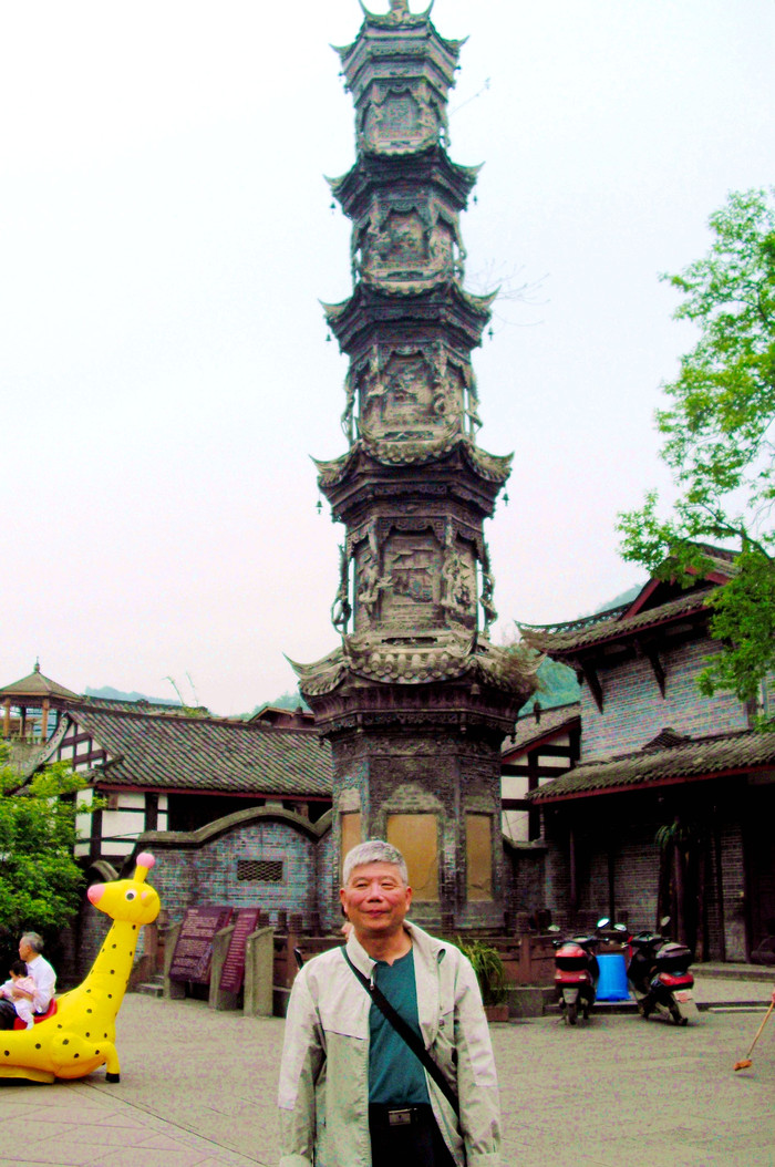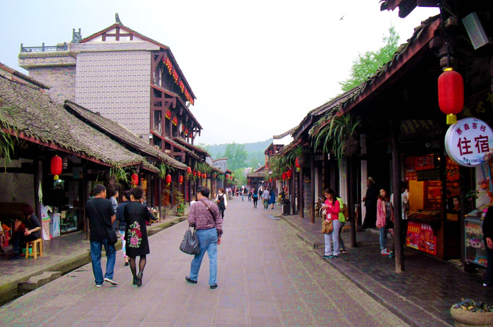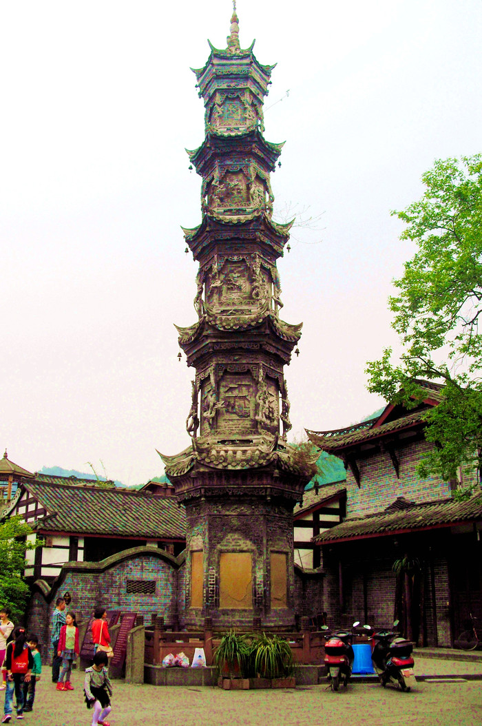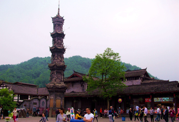 街子古镇现存以江城街为中心的六条街,街两边多为清代中晚期遗留下来的古建筑。民居布局,单檐青瓦,前店后院,建筑古朴而精巧。大多不事雕琢彩绘,反映出居民不张扬、不奢华、求实用的习俗,让人感觉亲切自然。街道两侧开着各色店铺,售卖古镇特色美食汤麻饼等,不妨买一个拿着边吃边走。街道的尽头是一座用石条、石墩和青砖建成的字库塔。字库是收存和焚烧字纸的专用设施,古人有“敬惜字纸”之风,“惜字得福”之说。街子的字库建于清咸丰年间,六角五级攒尖楼阁式,通高20米,借用佛教塔的基本型制,砖石中空结构。外壁浮雕刻绘《白蛇传》等戏文片断和山水花卉。为川西地区仅存的精美字库,彰显出街子人崇文尚雅的精神追求。