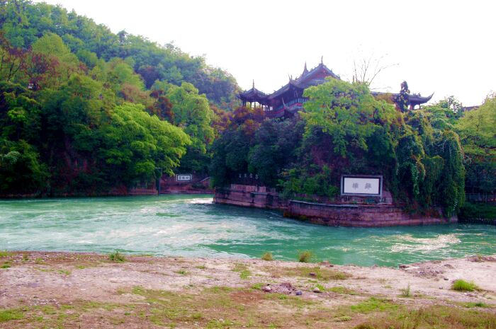 离堆,宝瓶口,鱼嘴。这是都江堰分流,泄洪的重要部分。